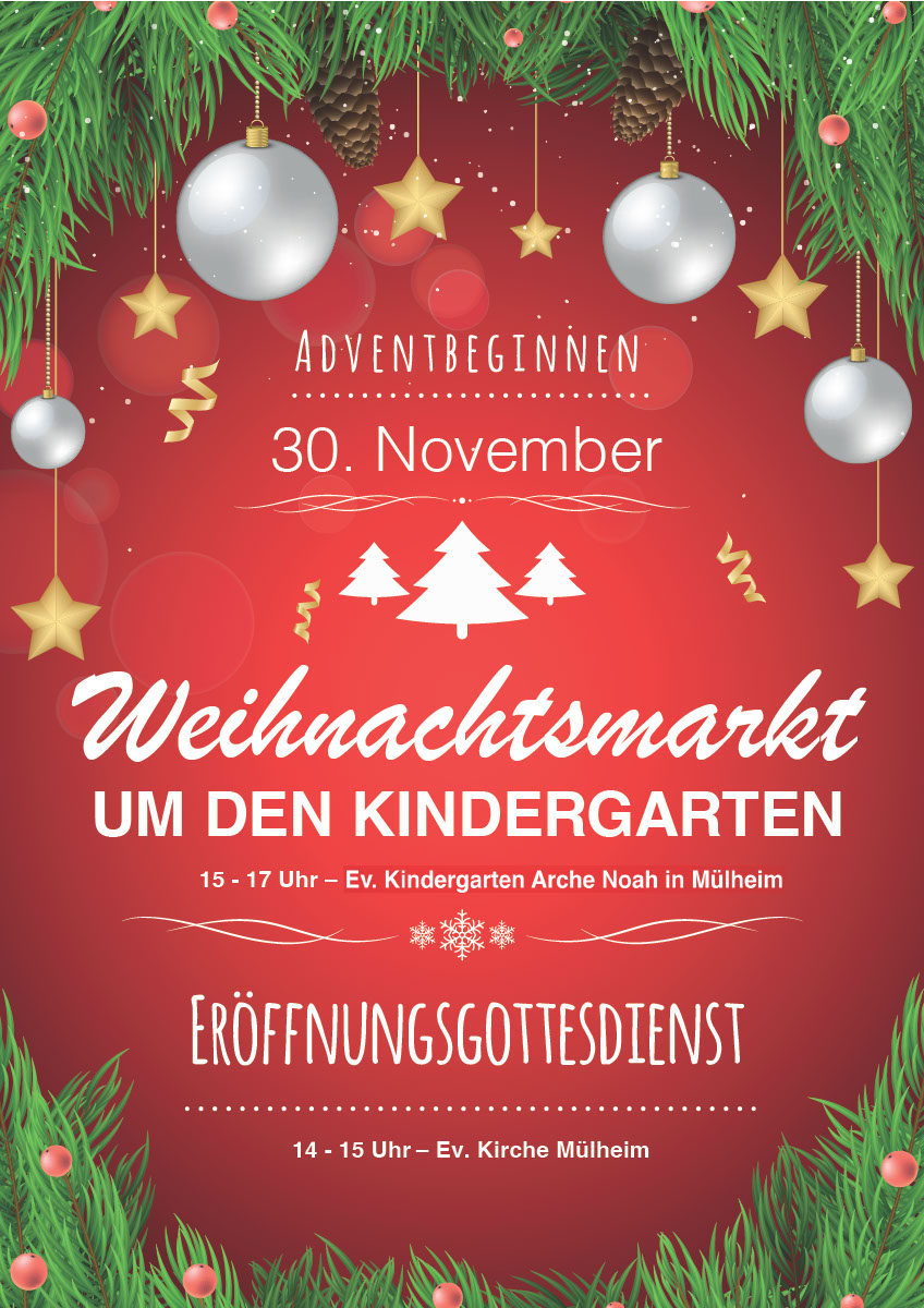 Auch in diesem Jahr laden wir alle Bürgerinnen und Bürger, sowie alle Eltern, Großeltern und Kinder zum Adventbeginnen ein, und zwar mit einem Weihnachtsmarkt rund um den Ev. Kindergarten (Im Flürchen 2) und das Ev. Gemeindehaus, Hauptstr. 10.
