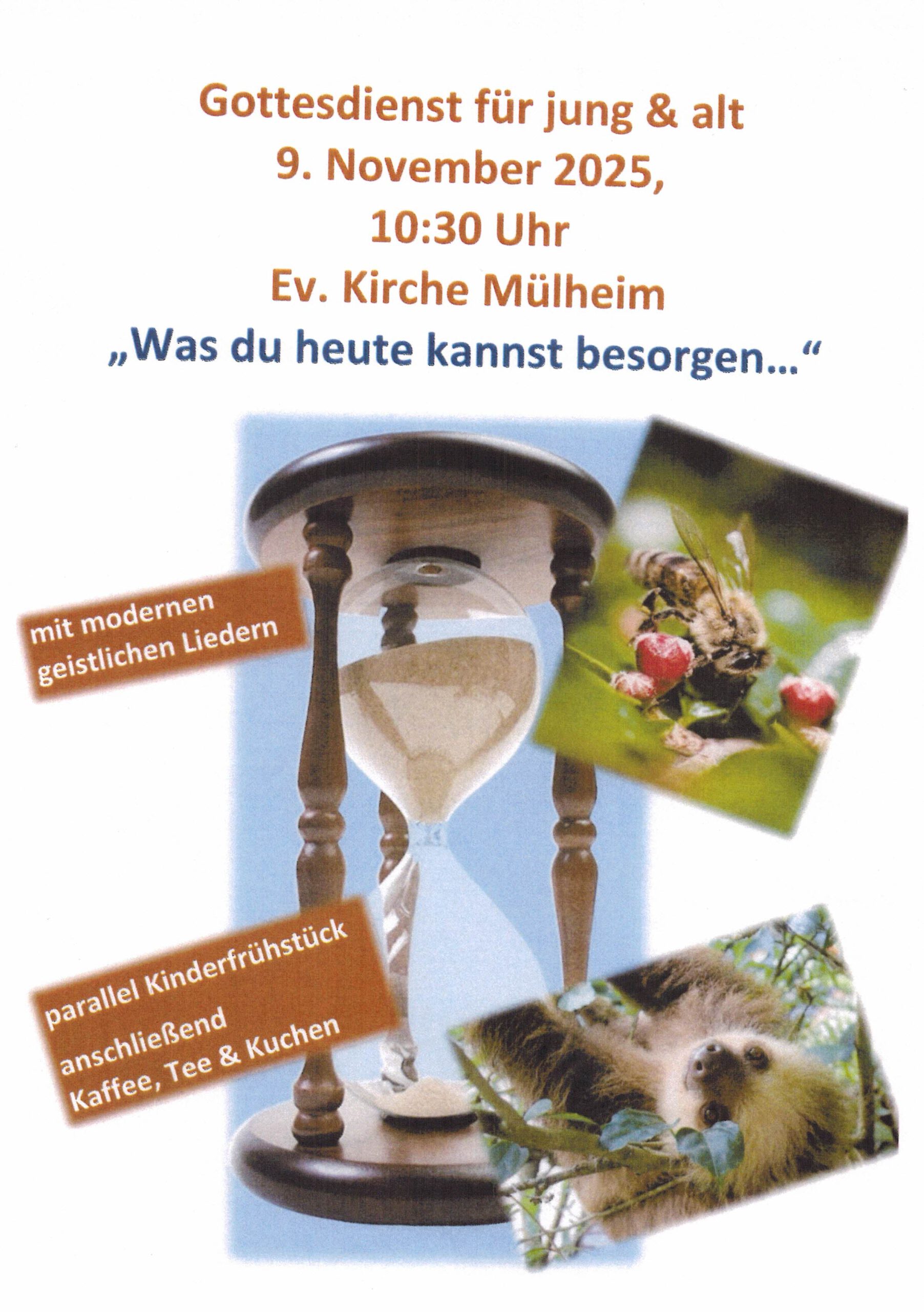 10:30 Uhr Gottesdienst für jung & alt in der Ev. Kirche in Mülheim Thema: ,,Was du heute kannst besorgen...",anschl. Kaffee, Tee & […]